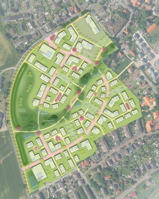 "Der Entwurf zielt darauf ab, an das kleinteilige, teils dörflich geprägte Umfeld des Plangebietes anzuknüpfen. Als prägnant wird zunächst ein starkes städtebauliches Rückgrat entlang der Tarnowitzer Straße als neuer Ortsrand wahrgenommen. Das gilt sowohl in seiner hochbaulichen Ausformulierung als auch in der Alleestruktur der Straße.