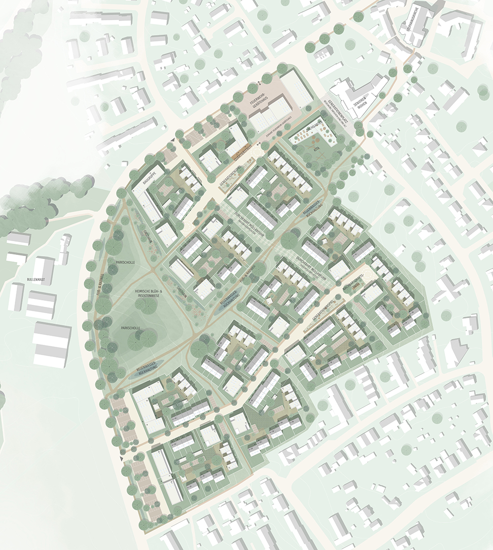 Begrüßt wurde auch der hohe Anteil an Begrünung. Für eine schrittweise Entwicklung des Quartiers sei das Motiv der Höfe von großer Bedeutung: Dort sind im Entwurf unterschiedliche Wohntypologien vertreten und es entstehen jeweils abgeschlossene und fertige Teil-Einheiten.