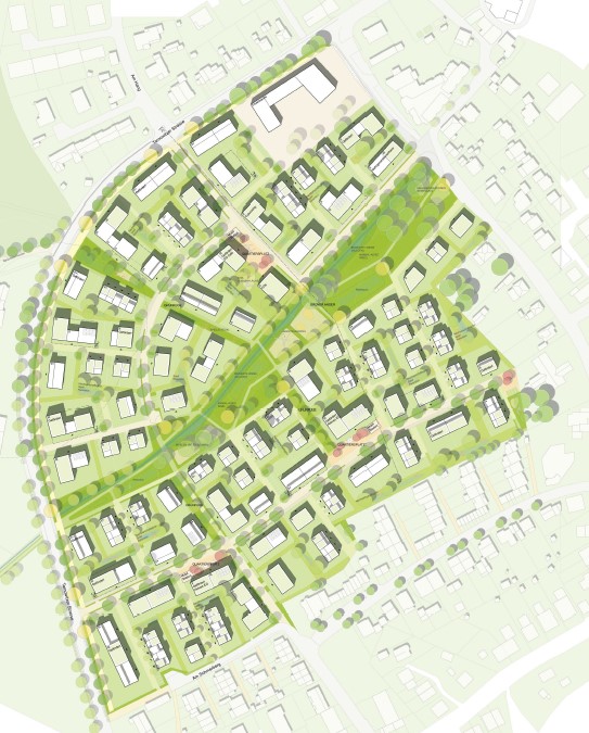 Insgesamt bietet der Entwurf interessente Anregungen für die Entwicklung (...) an, ist jedoch mit dem Erschließungsring und dem dominanten Geschosswohnungsbau etwas zu urban ausgefallen."